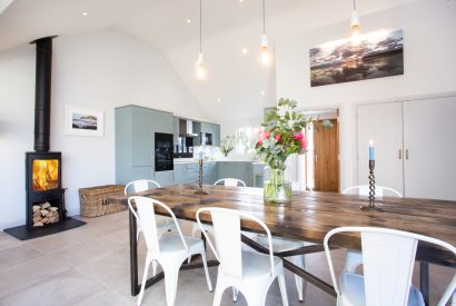 The open plan living space at 1 Higher Farm is vast and beautifully decorated. The stylish kitchen has tiled floors, soft blue cupboards and crisp white work tops. Here you have everything you need for preparing and enjoying holiday meals with friends and family. You can gather round the large wooden dining table that sits elegantly beneath high ceilings with feature lights dropping down from above.