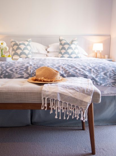 1 Higher Farm has four beautiful bedrooms. All are light and bright with a calming coastal colour palette. Built-in furniture provides all the space you need to unpack and make the space a real Cornish home from home. A beautiful wooden staircase winds up to a spacious master bedroom. This softly carpeted room has crisp white walls and an angled ceiling. The sumptuous en-suite provides the ideal space from which to unwind after a day on the sand and in the surf with a hot shower or bubble bath.