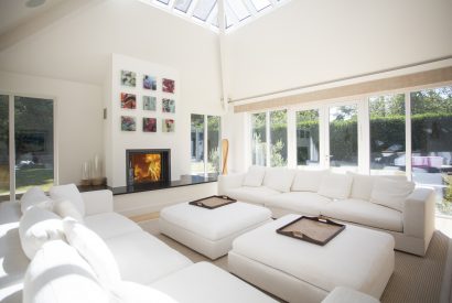 Whether work or play, there is sure to be a space to suit (and to keep all generations happy). A sunny reception room alongside the kitchen boasts a plush corner sofa and glass doors that open out to the garden. An impressive, glass-lined corridor leads to a stylish office, cosy TV room and opulent lounge. Here, two long white sofas frame the sleek fireplace, and daylight floods through from the roof and full height glass windows.