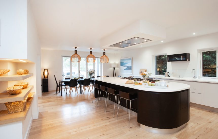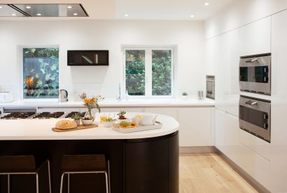 The expansive kitchen is finished in chic black and white. Culinary wizards can make themselves at home here, whipping up delicious breakfasts and desiccant suppers. These can be enjoyed either at the long statement dining table that sits alongside, or al fresco in the garden. A large breakfast bar provides the setting for morning coffee and buttery croissants, where the day's adventures can be planned.