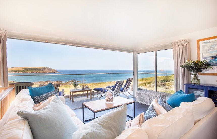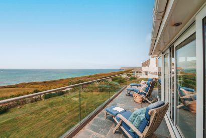 Inside, you will immediately feel at home with the relaxed, coastal ambience. A plush sunroom provides the ultimate spot to slip into holiday mode with views spanning across the water to Stepper and Pentire Point that frame the open sea. Open the floor to ceiling glass doors to the balcony and let the soft sea breeze flow in. Recline on the sun loungers and watch the rise and fall of the tide over the rockpools below.