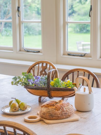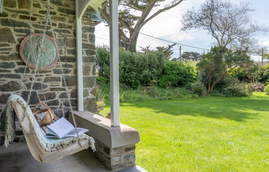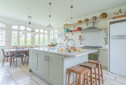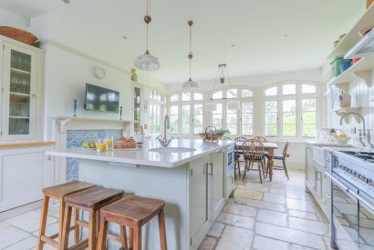 Inside, a sleek breakfast bar takes centre stage in the large family kitchen. Sunlight streams through the sash windows and large flagstones stretch out underfoot. Here you can whip up holiday feasts to be enjoyed around the chunky wooden dining table overlooking the luscious garden. Step out onto the sun-kissed veranda and enjoy a morning coffee gently swaying on the porch swing.