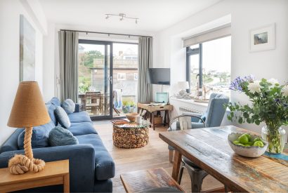 Inside, it's just as enchanting with a light and bright coastal colour palette. Sink back into the sumptuous velvet-blue sofa and bask in the warm ambience as sunlight streams through the expansive windows.