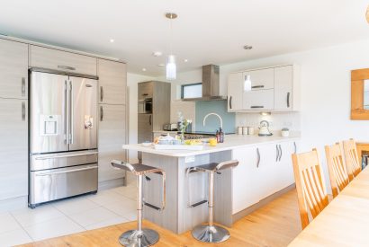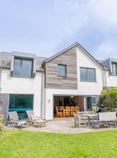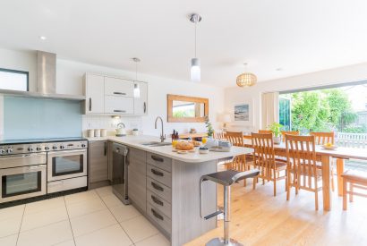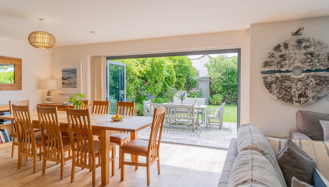 Inside, discover a bright and warm open plan living area to the back of the property. A large wooden dining table takes centre stage with vast bi-fold doors leading out to the patio. Alongside, a modern kitchen, complete with Rangemaster cooker and sleek breakfast bar, possesses all you would need for preparing indulgent family feasts. Pad across to the spacious living area, where squishy sofas in coastal hues await.