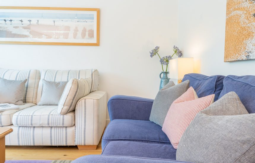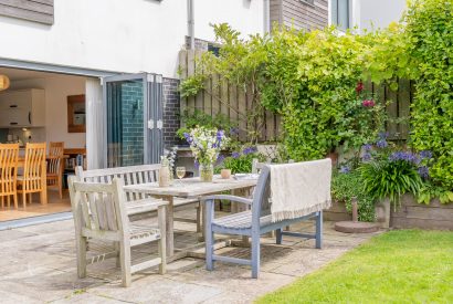 When the Cornish sunshine is calling, head outdoors to the sheltered garden. Peppered in pink hydrangeas and lush green foliage in summer, a soft lawn stretches out and provides a safe place for children to play. Two sun loungers offer an idyllic spot to relax with your favourite novel and a glass of something cold, whilst the wooden table and benches are perfect for al fresco dining.