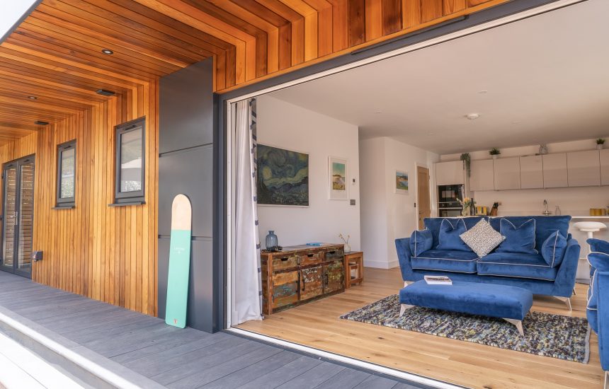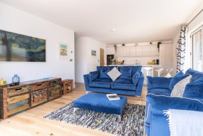 - Open plan living room with two, three-seater sofas, Smart TV and bi-fold doors to the sun deck.