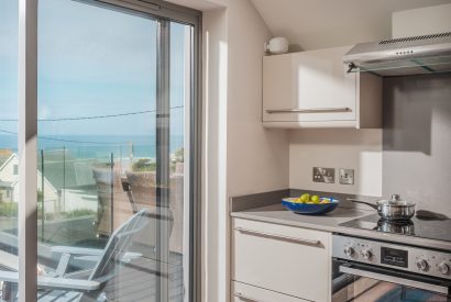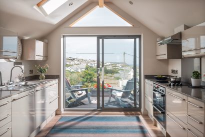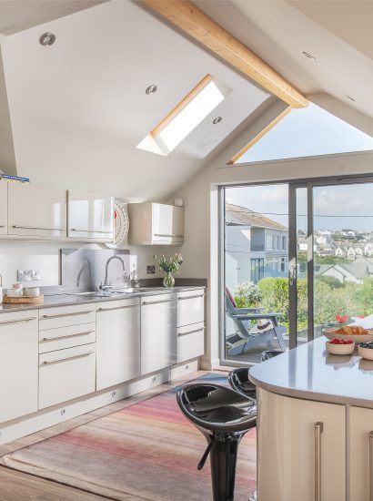 Full-length glass sliding doors lead from the kitchen to the balcony that stretches across the front of the house. Here you can relax and enjoy Polzeath at its best (especially with the added bonus of a sundowner).