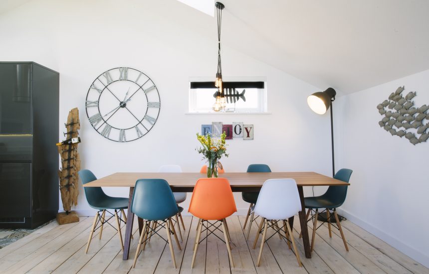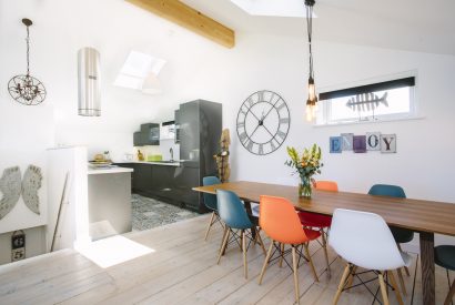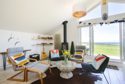 This stylish property combines beachside luxe with retro flourishes and modern comforts. On the first floor is a vibrant open-plan living area. Here you have a contemporary kitchen with everything you could need for holiday dining, a long statement table for entertaining and comfy seating areas for evenings in. A log burner ensures cosy evenings all round when the waves are crashing against the cliffs outside.