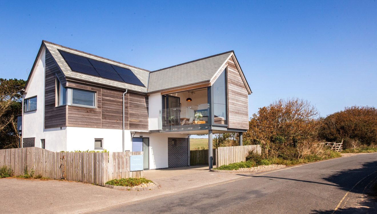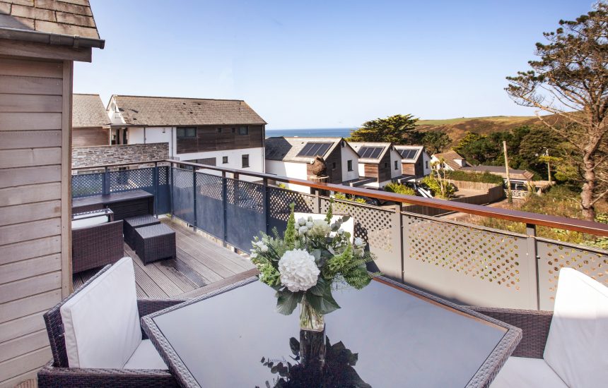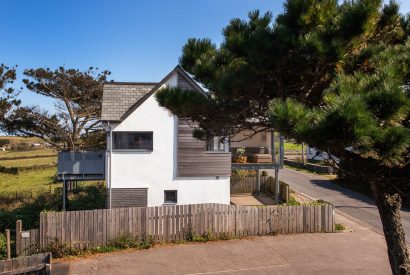 The lounge leads onto a balcony with a wooden floor and table and chairs. Here you can soak up the sun, breathe in the sea air and enjoy the views towards the ocean. The house is surrounded by stone paving and has an enclosed seating area to the rear with a heated outdoor shower and hanging rail; perfect for returning from the beach. To the front there is a bench for sitting and watching the world go by, while the right hand side of the property backs onto green fields and farmland as far as the eye can see.