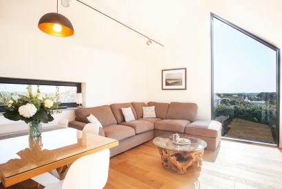 In the lounge you'll find plush, comfortable sofas and a large TV, perfect for cosy evenings and relaxation after a day at the beach. You can enjoy views towards Tristram and the ocean from the white Eames-style chairs that sit around the wooden farmhouse dining table.