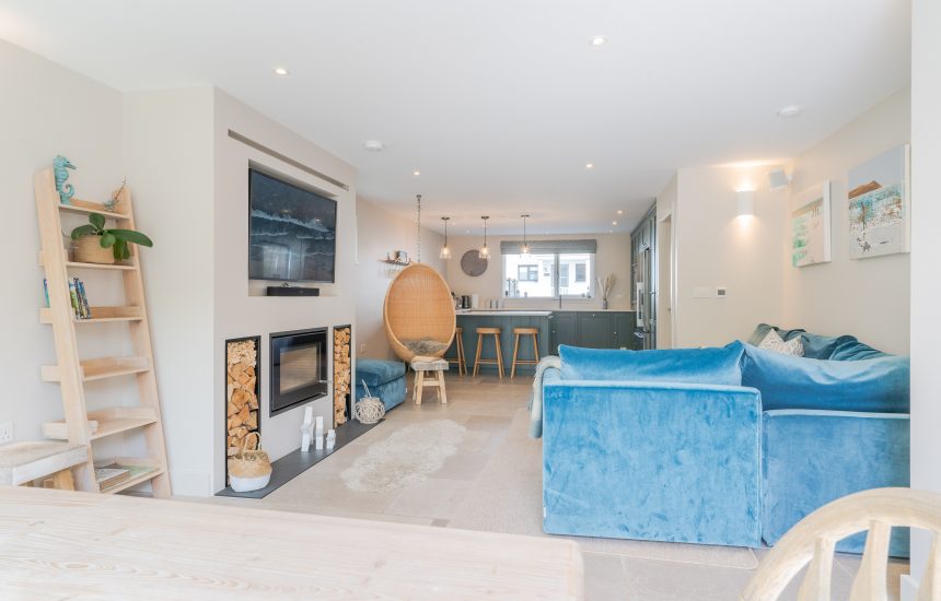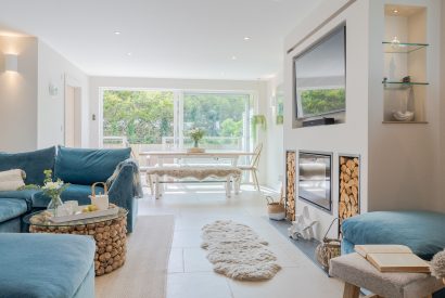 The ocean blue kitchen, complete with chic breakfast bar and crisp white worktops, has everything you need for holiday meal preparation. A statement dining table sits alongside full-height glass doors so you can enjoy the best of inside-outside living.
