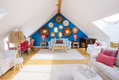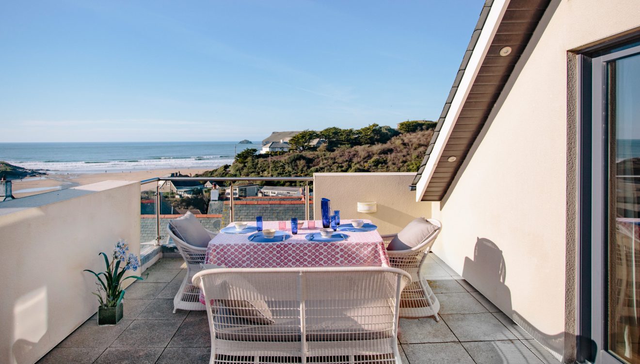The living space on the top floor is flooded with natural daylight, with a vast window making the most of the view across the Atlantic towards Pentire Point and beyond. Throw open the doors to the balcony and let ocean swells and dreamy sunsets form your holiday backdrop. If you can pull yourself away from the view, the table football table is sure to provide hours of holiday entertainment.