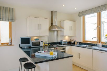 Discover a colourful dining room on the ground floor which provides a fantastic setting for holiday meals together. The kitchen has everything you need to make yourself at home including a breakfast bar for your morning coffee. Open the doors to the large sun deck which stretches across the width of the house. Here you have plenty of space to spread out and soak up the Cornish sunshine.