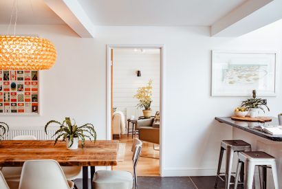 Prepare holiday breakfasts in the sleek kitchen; a vision in black and white. Enjoy your morning coffee at the chic breakfast bar and dine together around the chunky wooden dining table, with statement lighting hanging above.