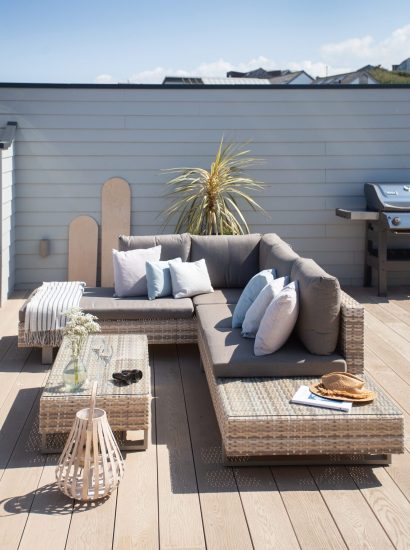 There aren't many properties in Polzeath (if any) that have their very own roof terrace. Here you can enjoy al fresco living at its very best with a spectacular vantage point above Polzeath and the valley behind. In summer recline on the colourful bean bags and get your dose of Cornish sunshine. The position of Hideaway's roof garden means you can enjoy the sun almost all day long - so balmy breakfasts are on the cards.