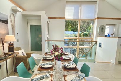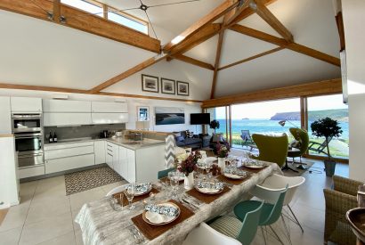 Inside, relax amongst elegant and plush interiors where artwork inspired by the coastal surroundings adorn the walls. Discover the colourful, open-plan social space on the top floor. Prepare holidays suppers in the sleek white kitchen and dine in style together under the beams of the high vaulted ceiling. Here you can spread out, open up the doors to the balcony and enjoy a local tipple or two in style. Enjoy crisp winter evenings storm watching as logs crackle on the wood burner.