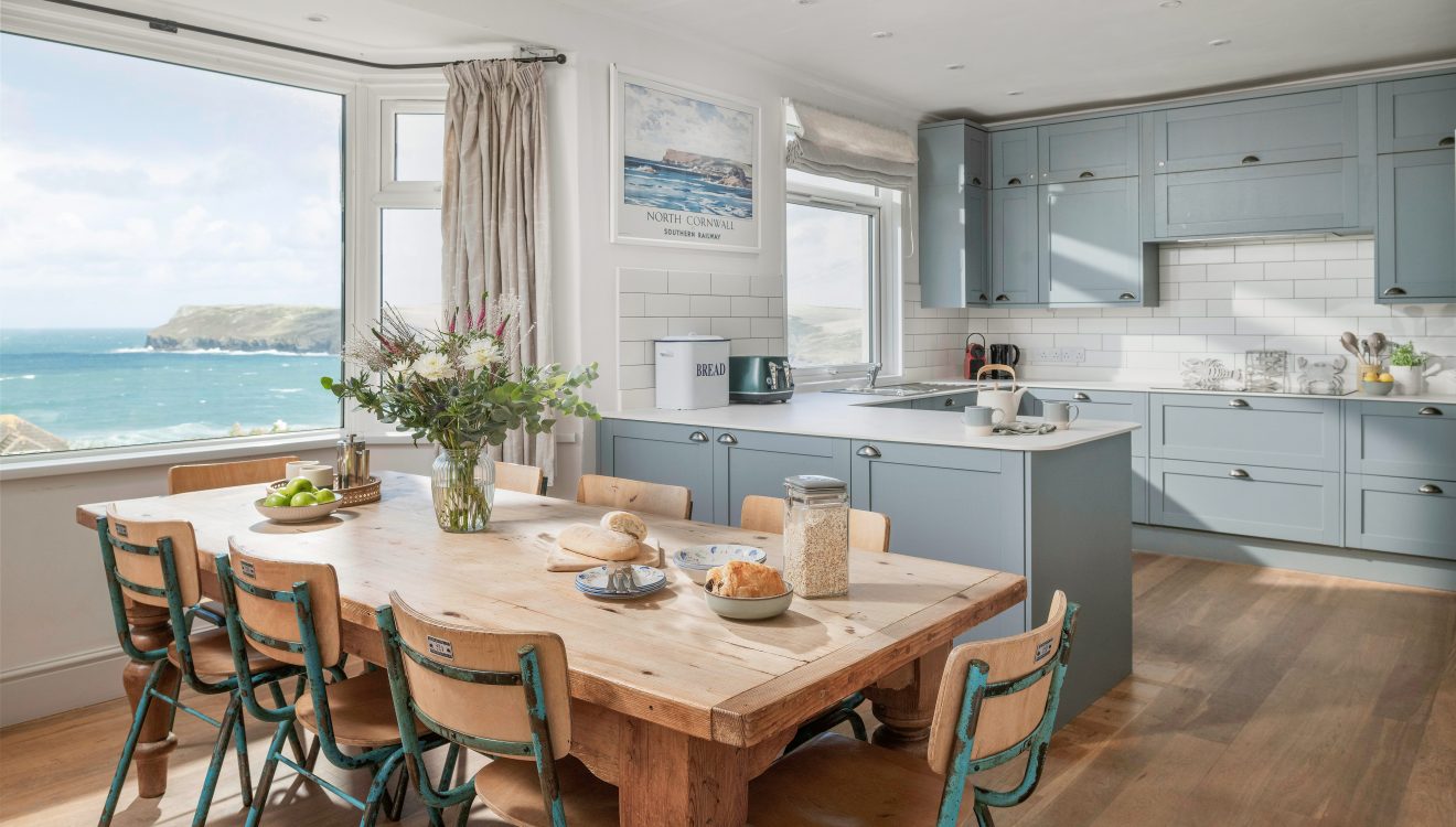 The kitchen has modern grey units and crisp white worktops, with a large farmhouse dining table facing the window. From here, you can enjoy a relaxing meal with spectacular sea views.