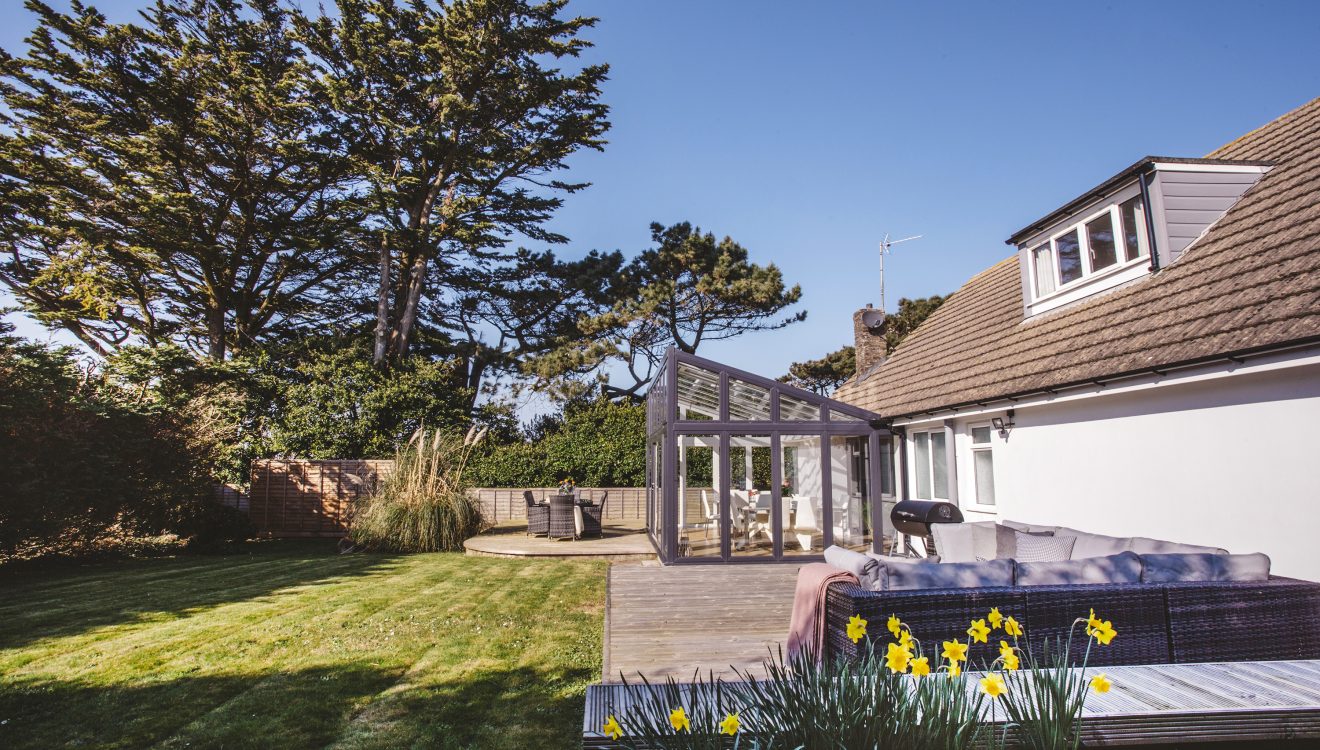 - Large garden with lawn and decking area with a gate that leads to the woodland footpath to Baby Bay and the National Trust Café and Fairy garden.
