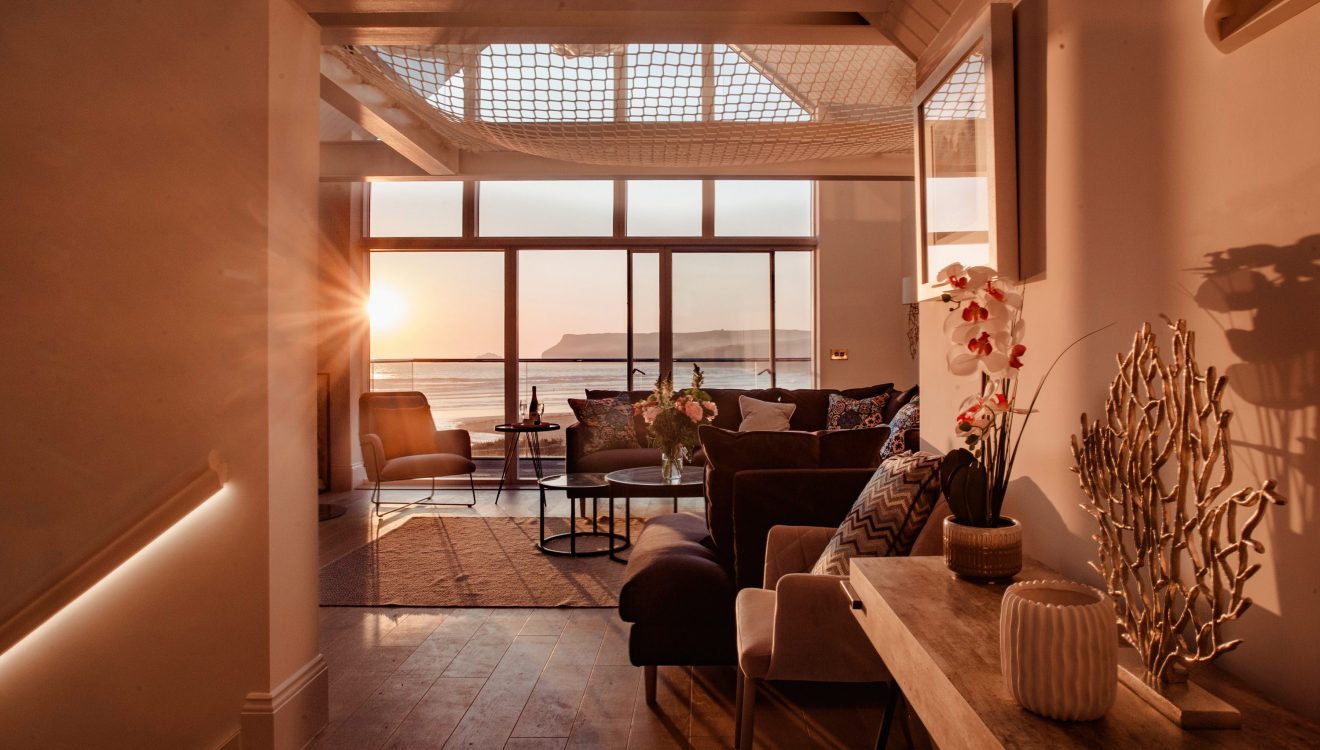 The top floor boasts the most stylish of split-level social spaces, perfectly designed for every occasion and time of day. Here you will find a contemporary kitchen, plush lounge with log burner, large statement dining table and your very own cocktail bar with mood lighting system. The living room opens out to a large balcony and here you can relax with a local tipple in hand and watch the sky change colour as the sun melts into the ocean. A cushion-filled sky hammock provides the most heavenly front row seat to dreamy Polzeath sunsets, night after night.