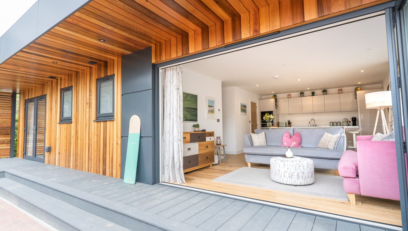 - Open plan living room with two, three-seater sofas, Smart TV and bi-fold doors to the sun deck.