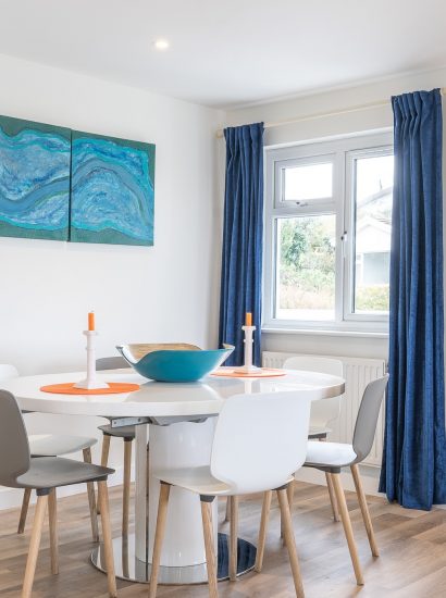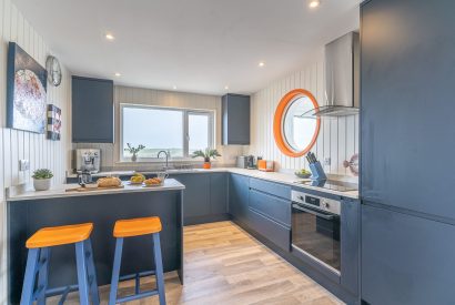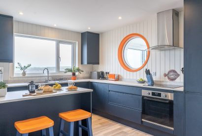 Inside, the open-plan living space is flooded with natural daylight and two vast picture windows perfectly frame the view across the Atlantic. A striking kitchen complete with port hole window sits alongside. Navy-blue units meet accents of burnt orange, creating a stylish environment to prepare holiday feasts. A breakfast bar provides the perfect spot to plan the day of coastal adventures.