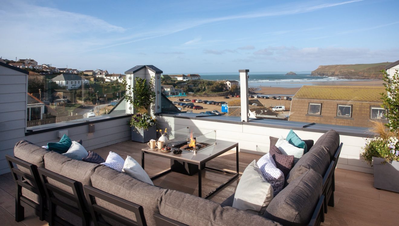 There aren't many properties in Polzeath (if any) that have their very own roof terrace. Here you can enjoy al fresco living at its very best with a spectacular vantage point above Polzeath and the valley behind. In summer, recline on the colourful bean bags and get your dose of Cornish sunshine. The position of the Seaview Penthouse roof terrace means you can benefit from uninterrupted sea views across the rooftops.