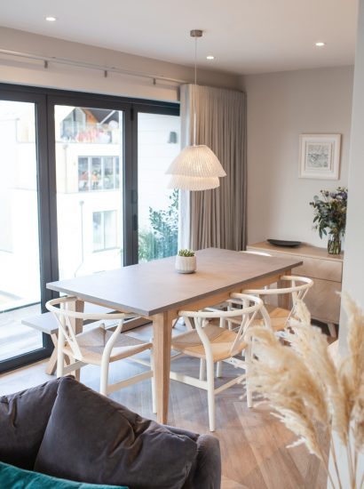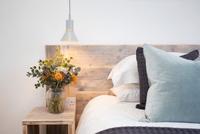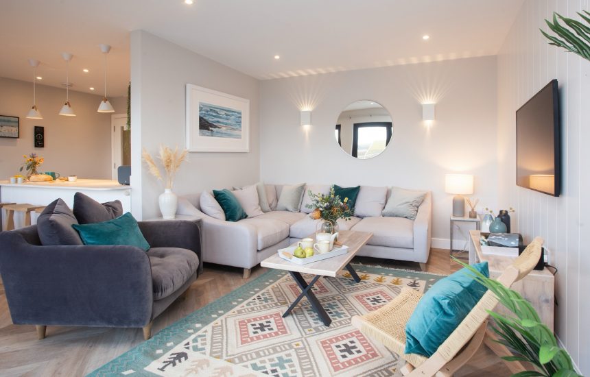 Inside, interior-designed living spaces create a relaxing and luxurious ambience. Light pours through the floor to ceiling sliding doors and a plush sofa provides the perfect place to relax after long coastal rambles. Prepare holiday picnics and delicious suppers from the comfort of the stylish kitchen. A long dining table with statement lighting sits alongside and here you can gather the family for quality time together.