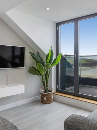 Upstairs, the master bedroom is quietly special. Tucked away at the top of the apartment, it opens directly onto a sun deck; a beautifully sheltered spot for slow mornings or evening drinks. From here, views stretch across the water towards Stepper Point, the rugged headland that lends the apartment its name and has guided sailors’ home for generations.