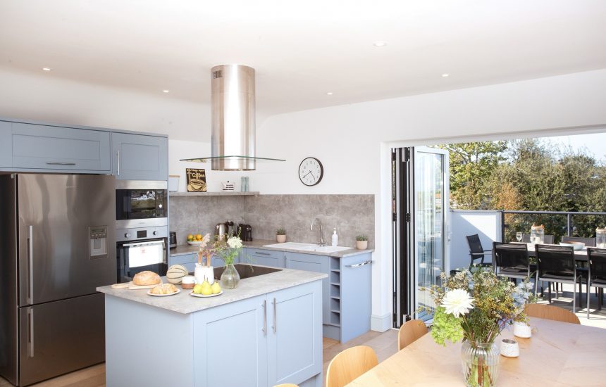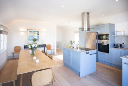 The spacious living room complete with a large window, roaring log fire and Sky TV, provides the perfect spot to recline post-surf. A cosy snug next door with a second TV and Nintendo Wii will be popular with the younger members of the party (and prevent any arguments over the remote)! The kitchen, finished in soft powder blue, has everything you need to make yourself at home. Enjoy delicious breakfasts and holiday suppers around the long table that sits alongside the kitchen or open the doors to the balcony and dine al fresco.