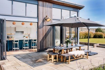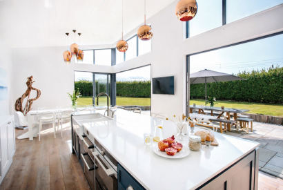 Take a seat at the chic white breakfast bar and enjoy a leisurely breakfast with some local treats picked up from the delis and farm shops nearby. The spacious kitchen has everything you need for holiday dining. Open the vast kitchen doors which create a free-flowing indoor-outdoor living space.