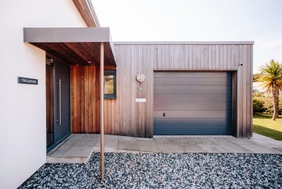 A large gravel parking area is located right alongside the front door to Tregarthen. A ramp leads up to the door. All social spaces as well as bedrooms three and four and the family bathroom are located on the ground floor. The patio can be accessed via the large sliding doors in the kitchen or via bedroom three. There are two steps up to the lawn.