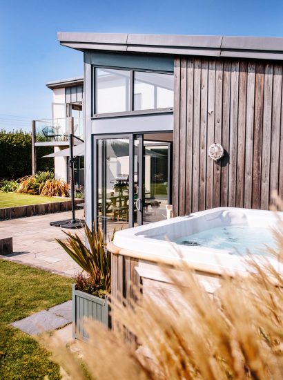 Soak up the sunshine in the sheltered garden bordered by beds spilling with coastal grasses and colourful blooms. Dine al fresco together around the chunky statement table where the large parasol provides welcome shade on summer days. End the day soaking in the hot tub as the sky softens and the gently unwinds.