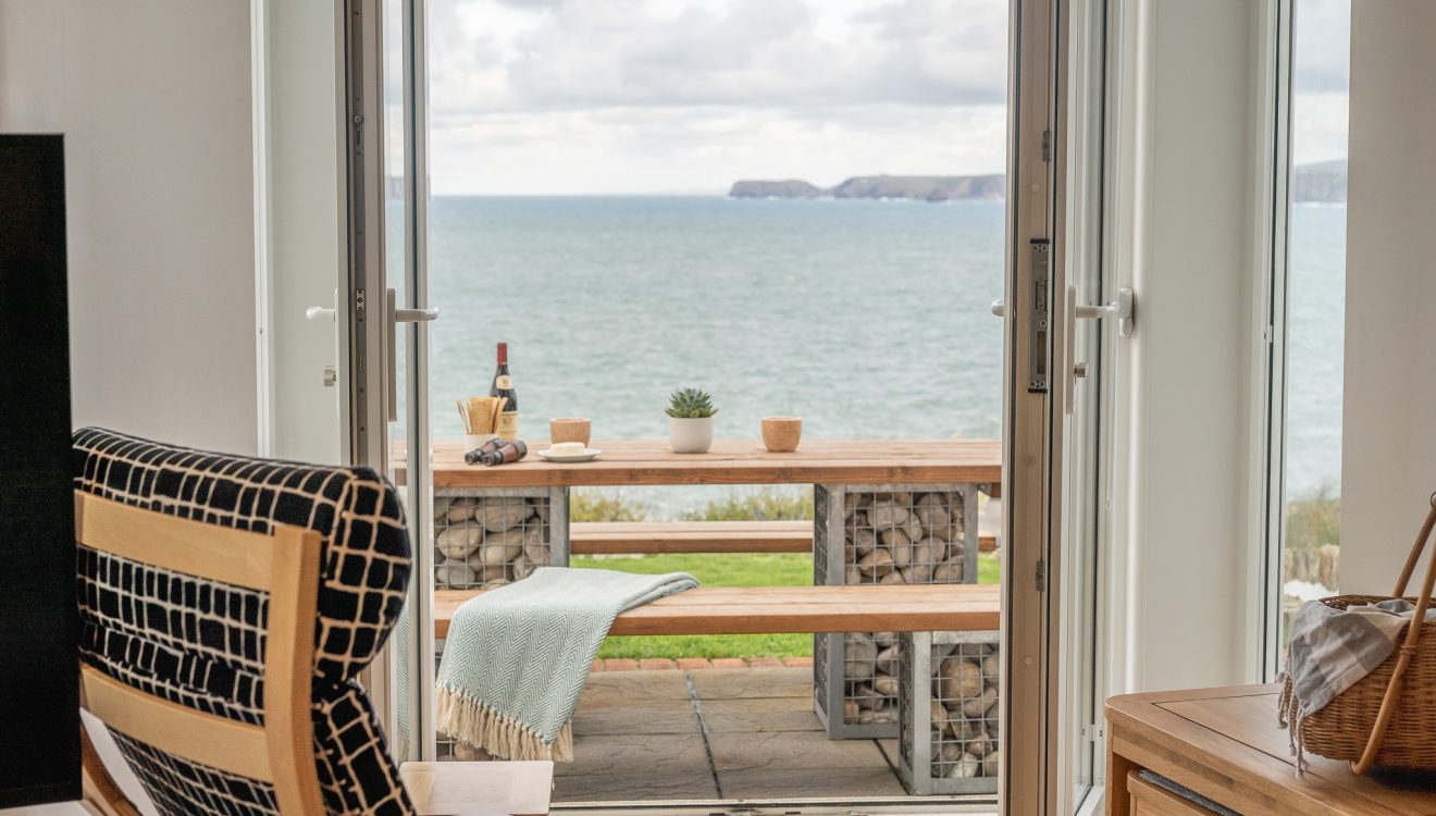 Throw open the double glass doors in the living room and let the soft sea breeze flow in. Here, you can enjoy a spot of al fresco dining on the patio around the chunky wooden picnic bench with decorative gabion pebble feet. A small lawn borders the patio and beyond, the Atlantic Ocean stretches out to the horizon. Your very own clapperboard grey beach hut with white door can be found up the path at the side of the building, providing safe storage for your boards and wetsuits.