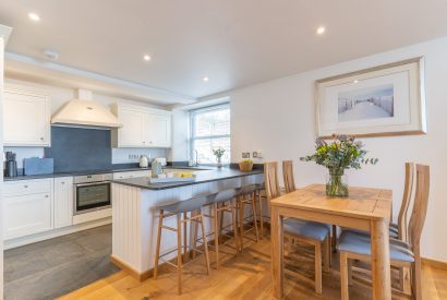 The open plan living spaces include a sinkable grey corner sofa where you can put your feet up and admire the view. A dining table sits alongside. Here, you can enjoy delicious holiday suppers with a famous Cornish sunset as your backdrop. A sleek kitchen has everything you need for home-from-home cooking including stylish cream Smeg appliances. A breakfast bar provides the perfect place to gather and plan the day's adventures with a fresh coffee in hand.