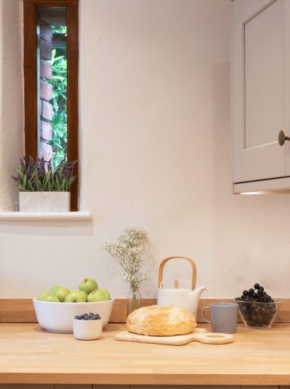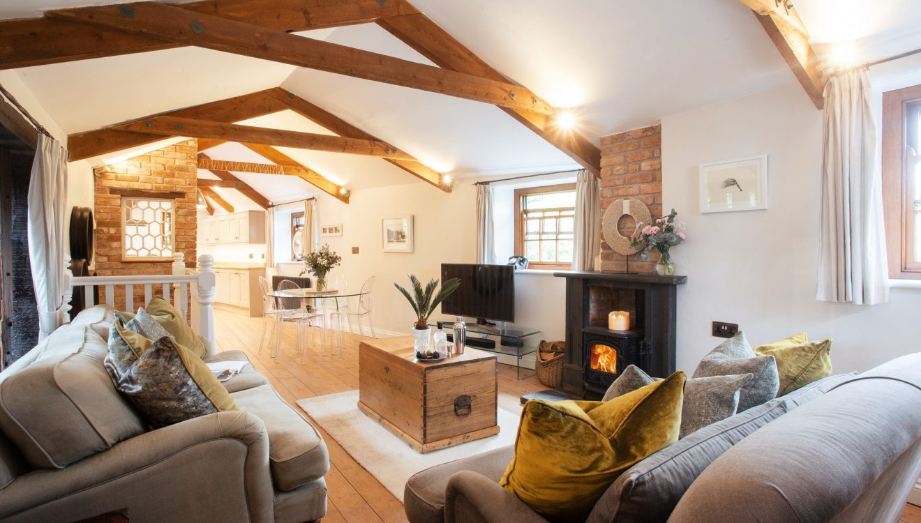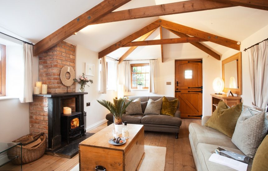 Inside, the rooms are deceptively spacious. An open plan living area sits under a vaulted ceiling with exposed beams and brickwork. These reclaimed finishes meet modern flourishes, creating a luxurious, homely ambience. A log burner crackles in front of plush grey sofas. Wooden floors flow into the kitchen and here you have everything you need to create holiday dishes with fresh fish from the local fishmongers.