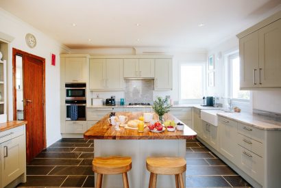 Inside, a vast, farmhouse-style kitchen, complete with slate floor, double Belfast-sink, and large island, provides everything you could need for holiday meal preparation. The kitchen leads into the sunny dining room, where a long statement dining table sits alongside floor to ceiling glass, making the most of the view across the garden. Throw open the door to the patio and let the soft breeze flow in.