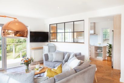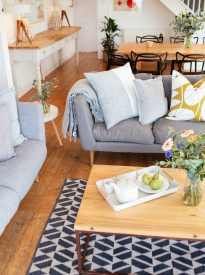 Sleepy souls can choose from four spacious bedrooms finished in a calming colour palette of white with blue and mustard accents. Upstairs, two en-suite double rooms sit under sloping eves. The master bedroom boasts sea views from the window that frames the king-sized bed below. Two vibrant twin rooms on the ground floor are perfect for children and friends where glass doors lead out to the garden.