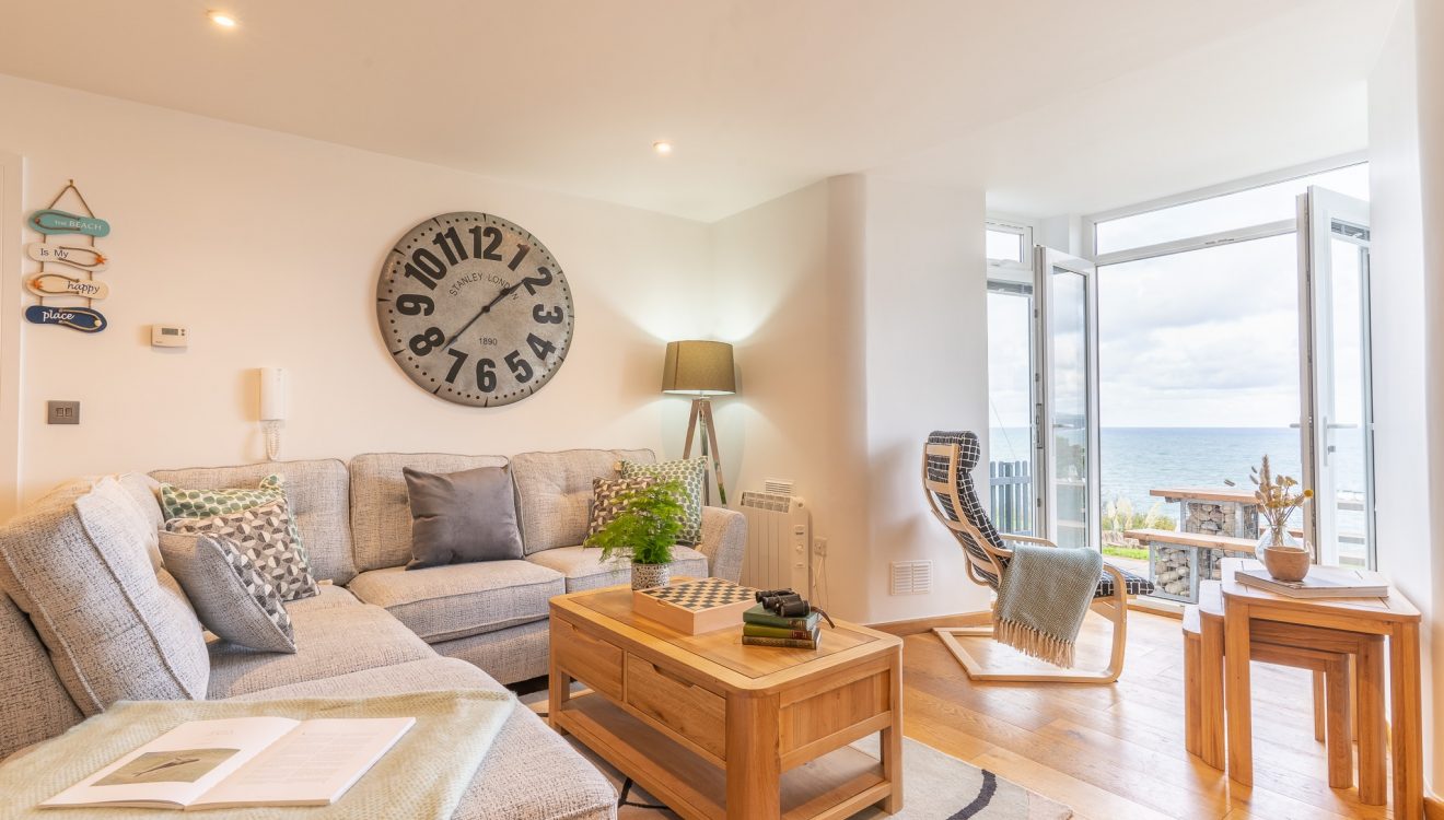 Throw open the double glass doors in the living room and let the soft sea breeze flow in. Here, you can enjoy a spot of al fresco dining on the patio around the chunky wooden picnic bench with decorative gabion pebble feet. A small lawn borders the patio and beyond, the Atlantic Ocean stretches out to the horizon. Your very own clapperboard grey beach hut with green door can be found up the path at the side of the building, providing safe storage for your boards and wetsuits.