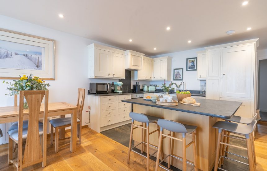 The open plan living spaces include a sinkable grey corner sofa where you can put your feet up and admire the view. A dining table sits alongside. Here, you can enjoy delicious holiday suppers with a famous Cornish sunset as your backdrop. A sleek kitchen has everything you need for home-from-home cooking including stylish mint green Smeg appliances. A breakfast bar provides the perfect place to gather and plan the day's adventures with a fresh coffee in hand.