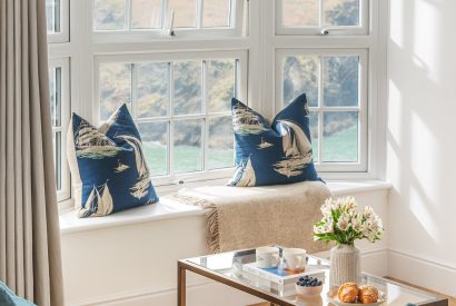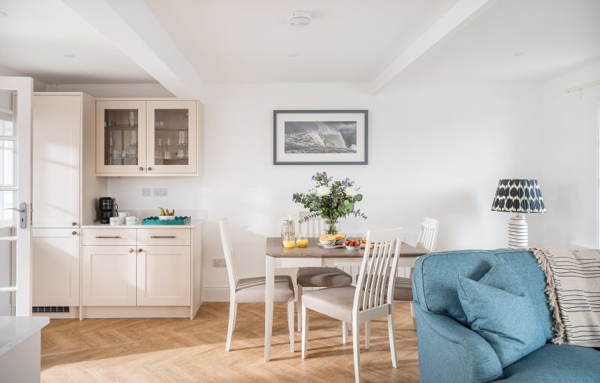 Step inside, and you’re greeted by an inviting open-plan living space designed with comfort and style in mind. A charming window seat frames the stunning views, offering a front-row seat to the changing tides. Whether you’re curled up with a good book, sharing a drink, or simply watching the world drift by, the living area makes the most of its coastal surroundings.