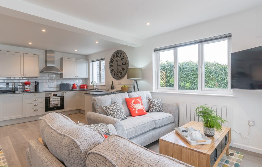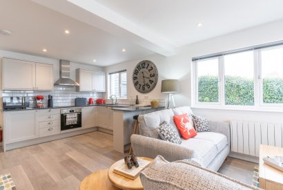 Inside, the open plan living area is warm and bright. The spacious kitchen is delightfully finished in a symphony of white with striking red Smeg appliances and chic black counter tops. Here, you have everything you need to prepare delicious picnics and holiday feasts (with some fresh lobster from the local fishmongers). The large, statement dining table opposite provides an atmospheric setting for wining and dining.