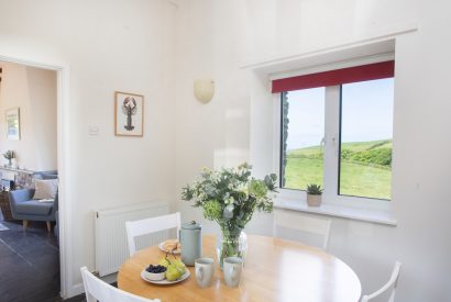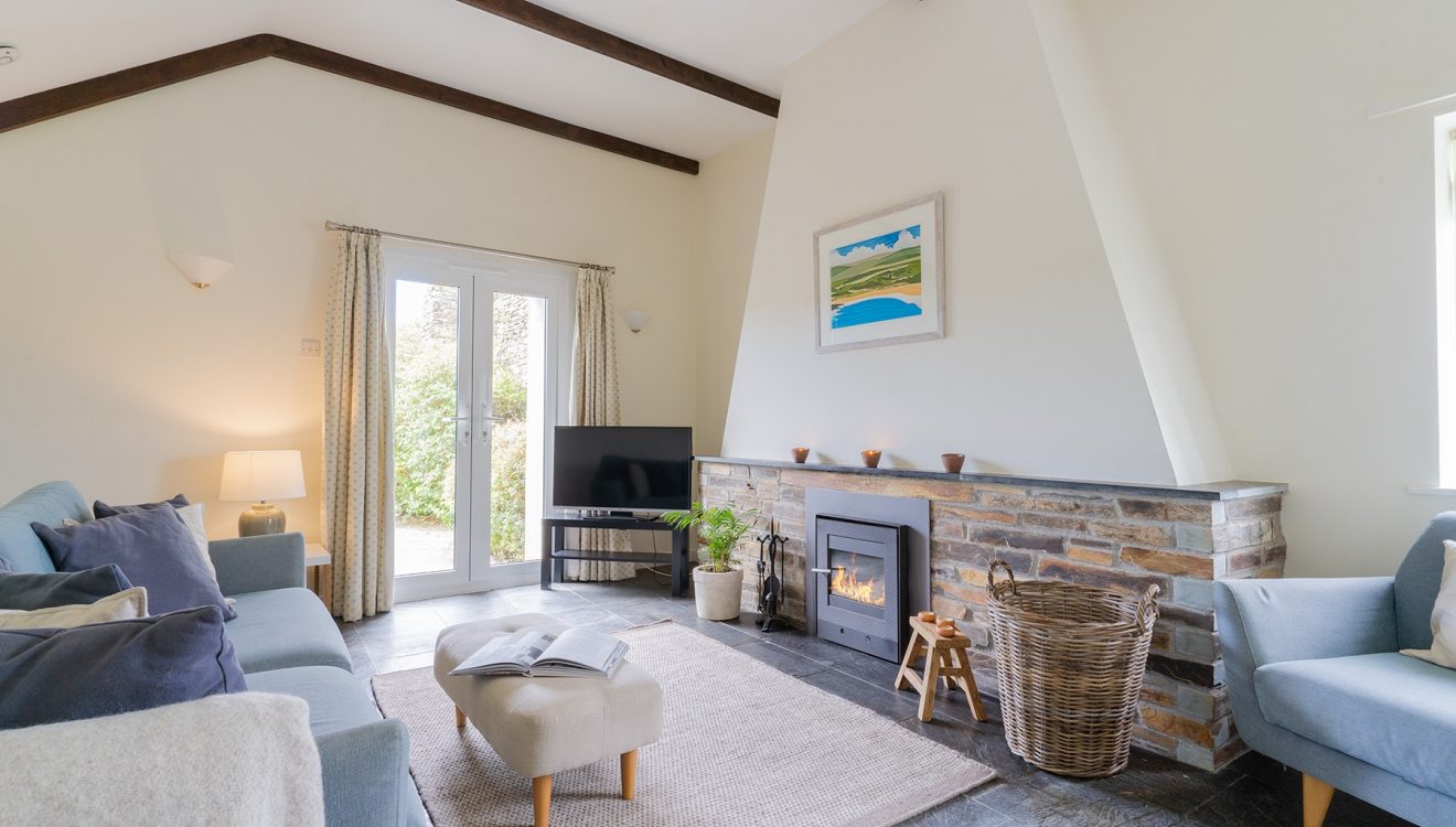 Slate flagstones sit beneath high vaulted ceilings in the kitchen and living areas. Gaze out across lush green fields that melt into the sea in the distance. In the morning, enjoy a relaxed holiday breakfast around the modern white dining table before heading out over the stile and on to the footpath for your countryside adventure. The welcoming log burner in the living room provides a cosy atmosphere to return home to.