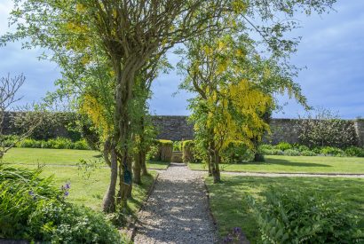 Through the French doors from the living room you’ll discover a delightfully sheltered courtyard. This suntrap provides the ideal place to enjoy a relaxing evening drink or a spot of al fresco dining. A Secret Garden-style stone wall rises up to the back of the space, providing shelter from the sea breeze, and a beautifully planted flowerbed stretches out in the other direction. The courtyard backs onto a charming Elizabethan walled garden belonging to the owner who is happy for guests to make use of and enjoy. Families with little ones and canine companions alike will delight in this space which is completely secure.