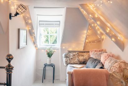 At the top of the house, the third bedroom offers a playful escape. Draped in rose-pink hues and fairy lights, it features a decorative iron bed nestled under whitewashed beams. A cosy sofa nearby provides the perfect nook for curling up with a book and a hot cup of tea, with the vibrant hum of village life and sea shanties drifting up from below.