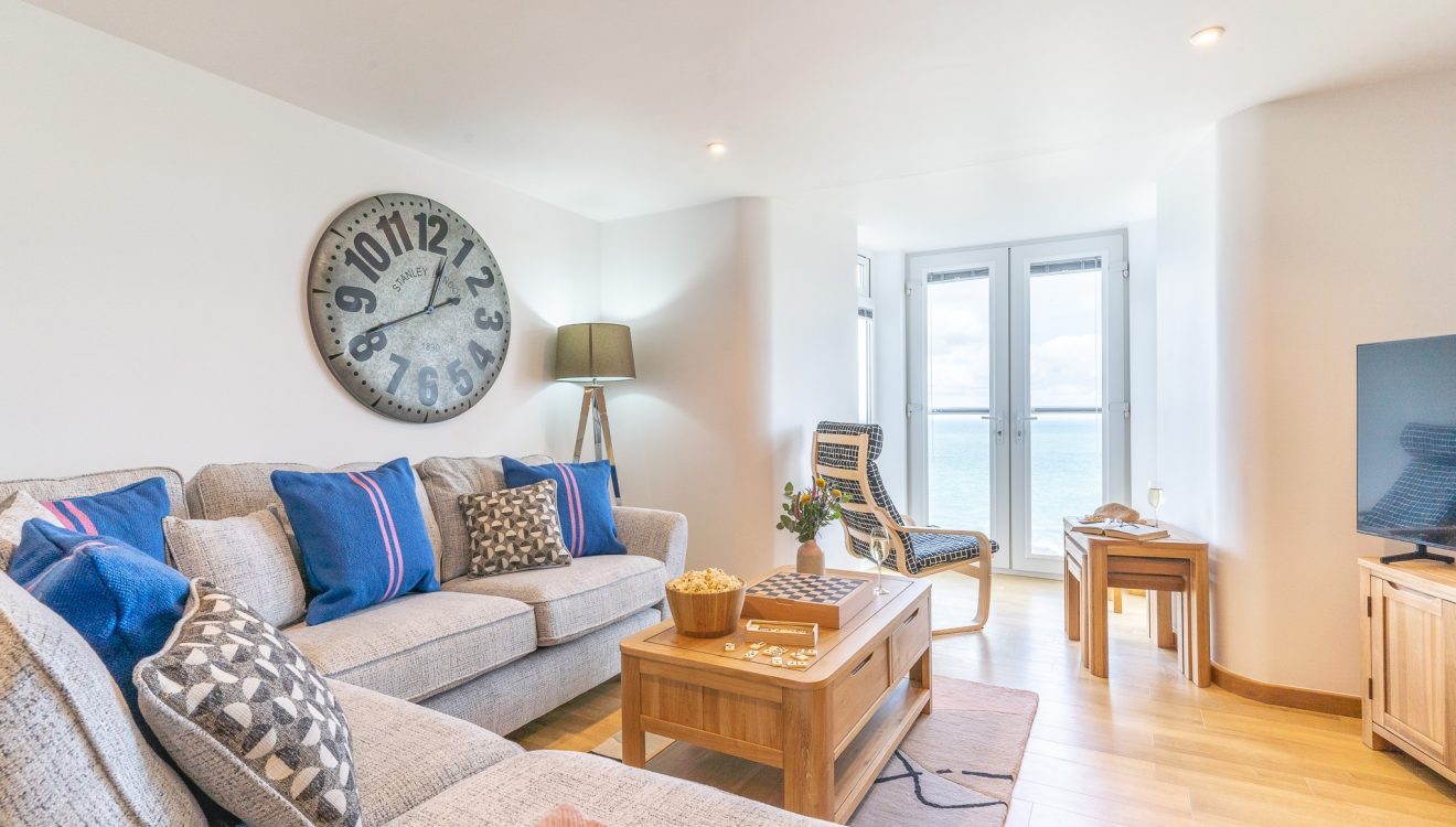 Please note: Tri can be let in conjunction with the other two-bedroom apartments in the No.7 building; Onan, Dew, Peswar, as well as Pymp the three-bedroom penthouse apartment and three-bedroom cottage The Cornishman located behind (sleeping a total of 28).