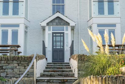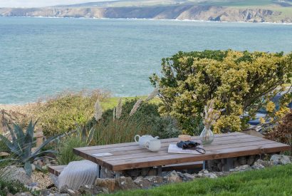 You may never want to tear yourself away from the view from the living room, but for al fresco dining, head to the bottom of the garden and discover a chunky wooden picnic bench with decorative gabion pebble feet. Here you can breathe in the sea-salted air and take in the sea views from a different vantage point. A beautifully planted shingle bed in front of you spills with succulents, grasses, pampas and deep pink hydrangeas. Your very own clapperboard grey beach hut with blue door can be found up the path at the side of the building, providing safe storage for your boards and wetsuits.