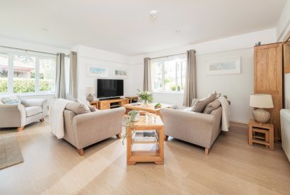 When you return, curl up on the armchair with a good book while the soft light from the panoramic electric fire flickers in the background. The spacious living room has plenty of comfortable seating and looks out on the surrounding garden.