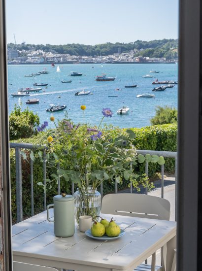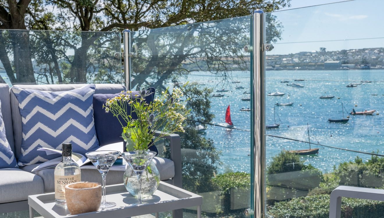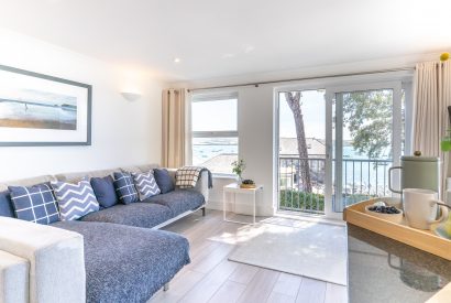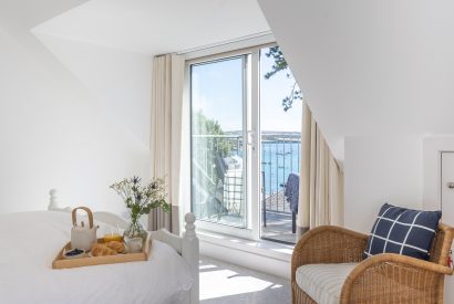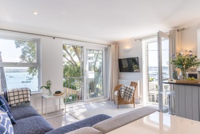 An open plan living space, finished in a modern white nautical style, frames the picture perfect views. After a day on the water, sink into the plush corner sofa and relax as you watch the world go by outside. Enjoy holiday feasts around the dining table perhaps with some Porthilly mussels or oysters on the menu. Open up the doors to the balcony and terraces and let the sea breeze in. Here, you can enjoy a local tipple or two watching the sun set across the water beyond.