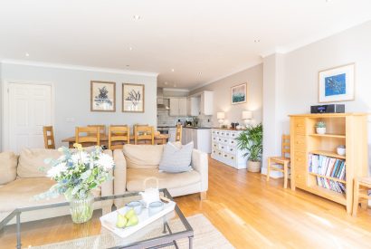 On the ground floor discover a large open plan living area with plenty of space for the whole family to spread out. Full length windows positioned beside squishy sofas let the daylight flood in and provide the ideal setting for a holiday feast, cosy evenings in and holiday board games. A modern kitchen is equipped with all you need for preparing holiday picnics and indulgent breakfasts.