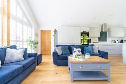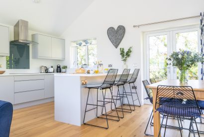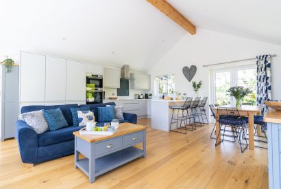Inside, the stylish interiors harness a palette of white and royal blue, reminiscent of the calm estuary waters. Vaulted ceilings and full-length windows combine to create a feeling of space and light. Discover a contemporary kitchen in crisp white and soothing grey with a cosy seating area in royal blue alongside. In summer, throw open the patio doors and left the soft breeze flow in as you indulge in holiday feasts at the statement wooden dining table.